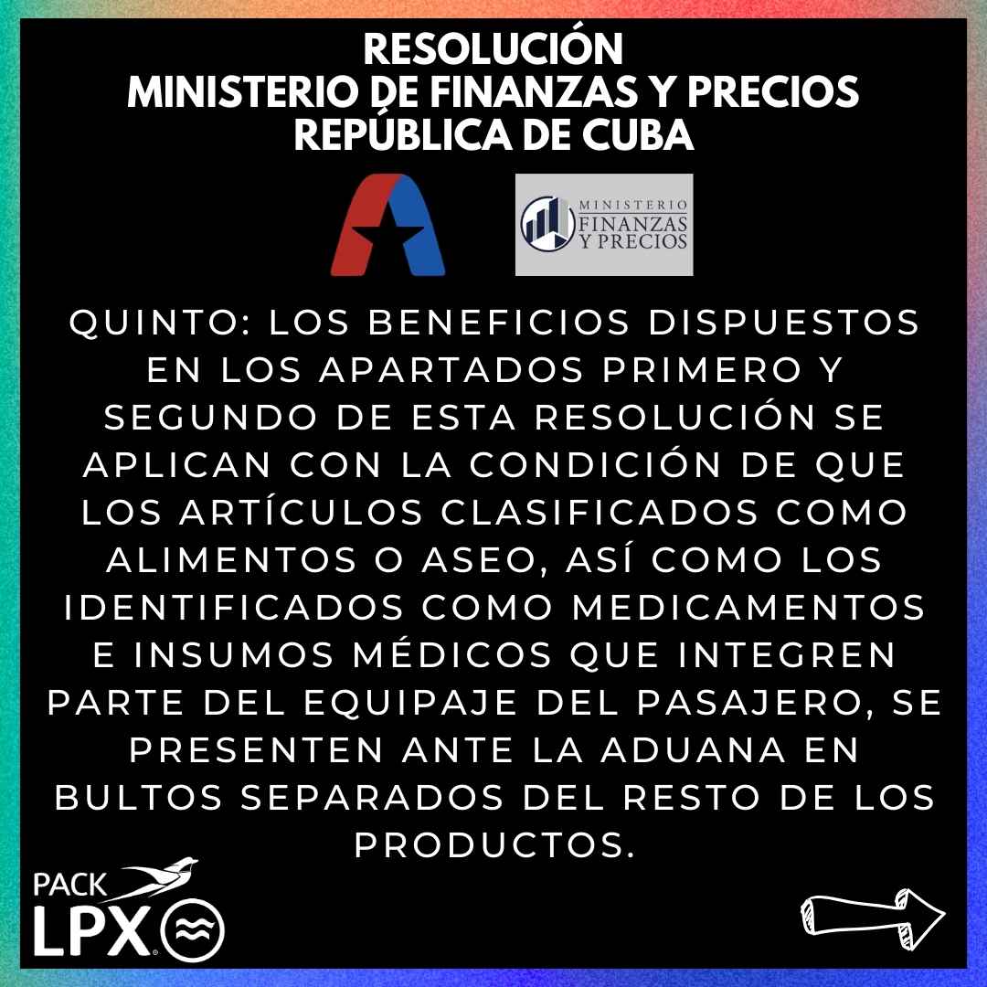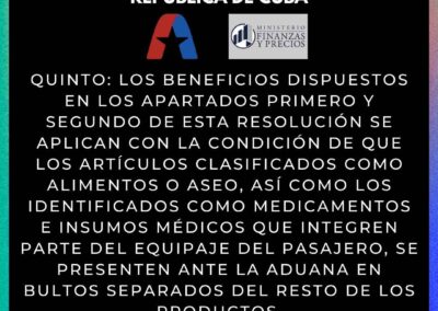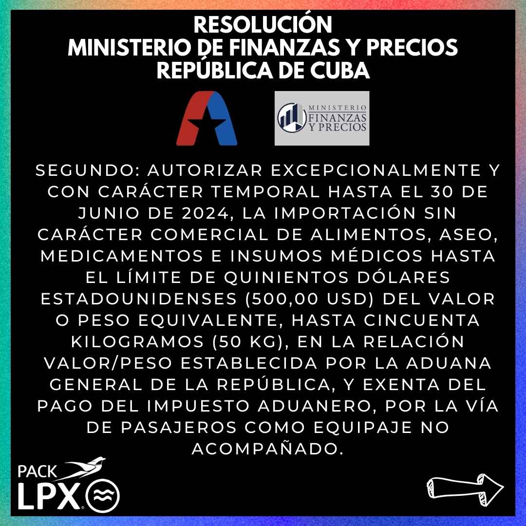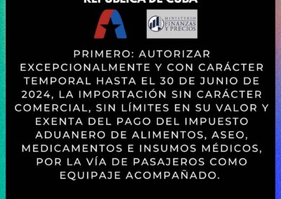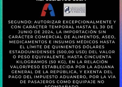 ✔Se autoriza la exención del pago del impuesto de aduanero a los productos importados clasificados como alimentos, aseo, medicamentos e insumos médicos que se importan por los pasajeros como equipaje no acompañado hasta un limite de 500 dólares estadounidenses (USD) del valor o peso equivalente hasta (50) kilogramos en la relación valor/peso establecida por la Aduana General de la República.