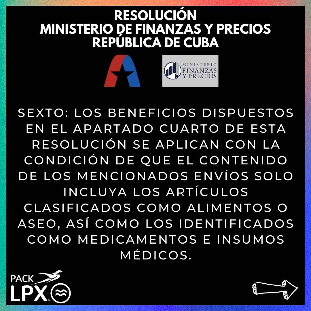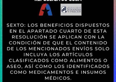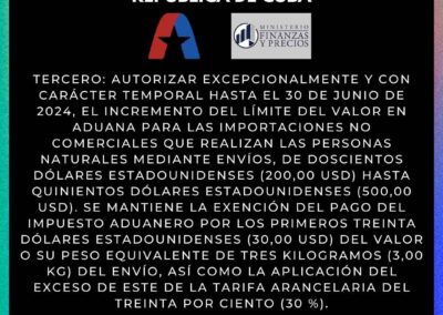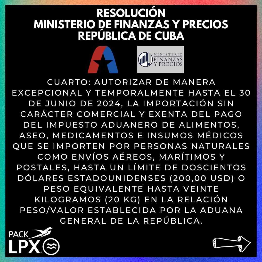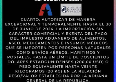✔Se prorroga la exención del pago del impuesto aduanero de alimentos, aseo, medicamentos e insumos médicos que se importan sin carácter comercial por personas naturales como envíos aéreos, marítimos y postales hasta un límite de 200 USD o peso equivalente hasta (20) kilogramos en la relación peso/valor establecida por la Aduana General de la República.