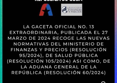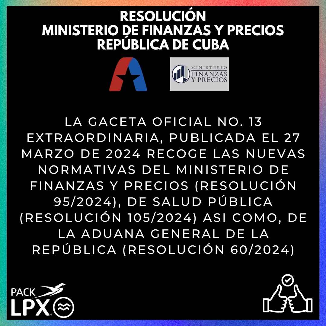 ✔La Gaceta Oficial No. 13 Extraordinaria, publicada el 27 marzo de 2024 recoge las nuevas normativas del Ministerio de Finanzas y Precios (RESOLUCIÓN 95/2024), de Salud Pública (Resolución 105/2024) así como, de la Aduana General de la República (Resolución 60/2024).